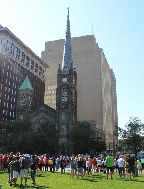 Pan Am Masters Games athletes gathering in front of the Old Stone Church on Cleveland's Public Square