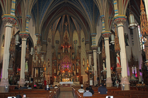 The cornerstone of the church was set in 1889 to primarily serve the large German population. After a fire, the new church was completed in 1892. It is of High Victorian Gothic architecture and was said to be the tallest edifice in Cleveland until 1922. It is said to still be Cleveland's tallest church. The German population gradually dwindled and the Hispanic population grew. The first Spanish Mass was said there in 1971 and most Masses are now bilingual (English and Spanish).