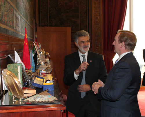 Mayor Jackson gave the Prime Minister a tour of his office and explained the tapestries and other artifacts in the room.