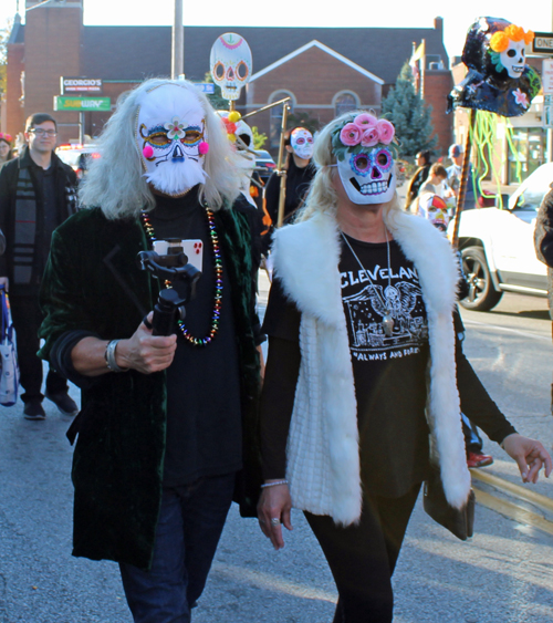 The Skulls & Skeletons procession stepped off from Cleveland Public Theatre at 6205 Detroit Ave. and traveled west on Detroit. It made a stop at an altar at Our Lady of Mount Carmel Church and then another at Craciun-Berry Funeral Home. Then it turned around and went back to the Theatre. Here is a video of highlights of the 2024 Day of the Dead Parade in Cleveland.
