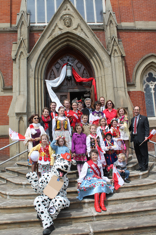 Community leaders posed on the steps of the Shrine Church of Saint Stanislaus for a photo as the church bells tolled.